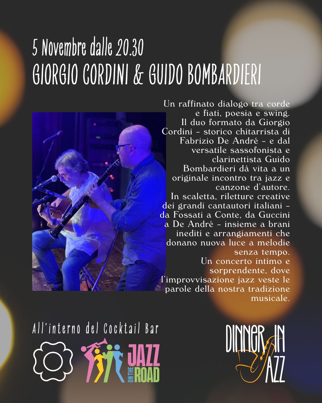 Il duo, che è formato da Giorgio Cordini (chitarra e voce), per otto anni chitarrista di Fabrizio De André e da Guido Bombardieri (sax soprano e clarinetto), fantasioso solista bergamasco, vive di un insolito e inedito connubio tra jazz e canzone d’autore. I due musicisti ripercorrono le opere più significative di grandi cantautori come Ivano Fossati, Paolo Conte, Francesco Guccini, Battisti, Fabrizio De Andrè ed altri ancora, oltre a proporre alcune composizioni inedite. Le canzoni eseguite non sono soltanto naturali tracce utili all’improvvisazione, ma vengono rivestite di arrangiamenti particolari, che danno nuova vita a motivi classici e a melodie intramontabili.
